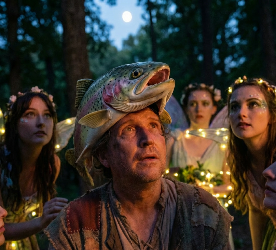 "We gave some performances at the Minack Theatre in Porthcurno, Cornwall. It is a beautiful amphitheatre, high on a cliff with the sea behind the actors. It was a wonderful venue and we thought it might be good to replace the ass head with a fish head in order to give the production a direct connection with the environment. We modified the dialogue accordingly so that at one point Bottom accuses his friends of making a "cod's piece" out of him."